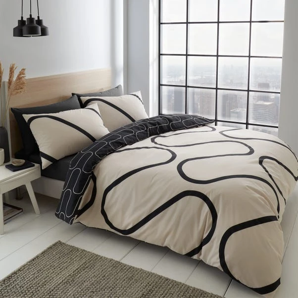 Elevate your bedroom decor with this effortlessly modern duvet cover and pillowcase set, embellished in an abstract geometric pattern. Made from sustainable recycled polyester and responsibly sourced cotton, carefully combined to ensure practicality and softness for daily use. Available in multiple bedding sizes and boasting machine washable attributes, this reversible bedding design ensures versatility, stunning aesthetics, and easy upkeep.