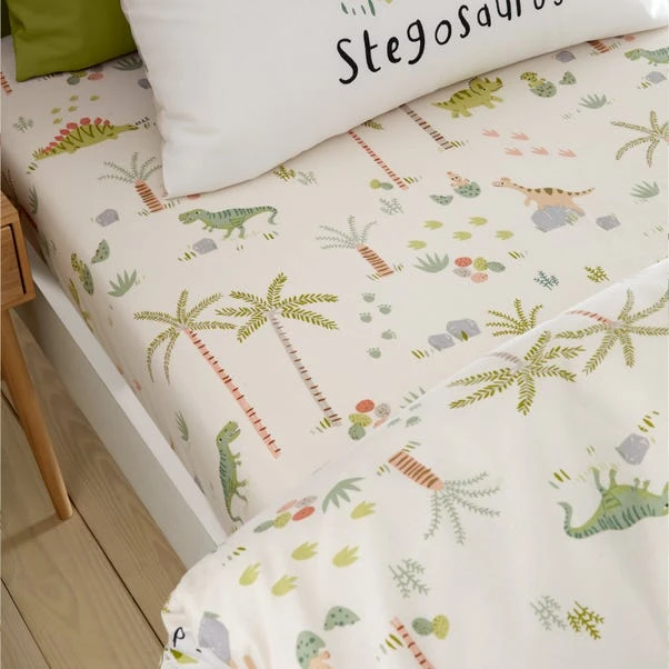 Send your little explorer off to dreamland with the Catherine Lansfield Sleepy Dino Fitted Sheet. Featuring adorable dinosaurs roaming through lush greenery, this playful design brings a sense of adventure to bedtime. Made from an easy-care polycotton blend, it provides a soft, breathable, and durable sleeping surface. Fully elasticated for a secure fit, this fitted sheet is also machine washable for easy upkeep.